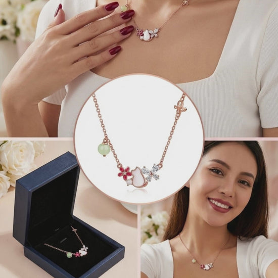 Imagine a serene garden in early spring, where peach blossoms are in full bloom and a curious kitten chases a golden butterfly through the petals. The Peach Blossom Kitten Necklace captures this enchanting moment of playfulness and rebirth. It is a tribute to the dreamer, the nature-lover, and the woman who carries a touch of springtime magic wherever she goes.